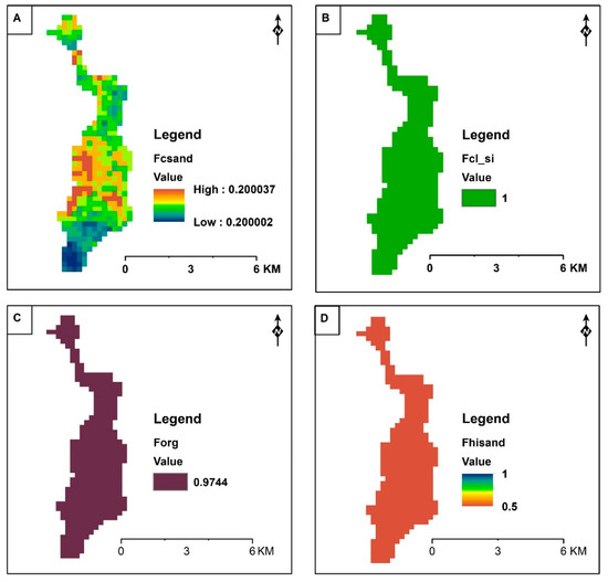 Soil erodibility (the K factor) represents the resistivity of soil particles to the impact of a raindrop. K is determined based on soil physical and chemical properties, such as the percentage of silt, clay and sand, organic carbon content and soil structure and permeability [19]. Data scarcity was again an obstacle in the study area. Previous authors [19,24] estimated K values based on observed soil color, as suggested by Hurni [23]. Williams [25] estimated K as a function of the percentage of silt, clay and sand and the organic carbon content of the topsoil. We explored different soil databases, including those of the Ethiopian Ministry of Water, Irrigation and Energy, the Ministry of Agriculture and Natural Resources and the Food and Agricultural Organization of the United Nations (FAO). Ultimately, we used data from the International Soil Reference and Information Centre (ISRIC), as it had better resolution (1 km × 1 km) than the other sources. The following function was used to generate a K factor raster map for the catchments: