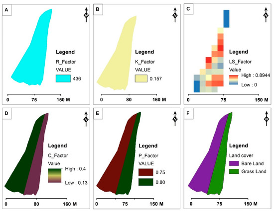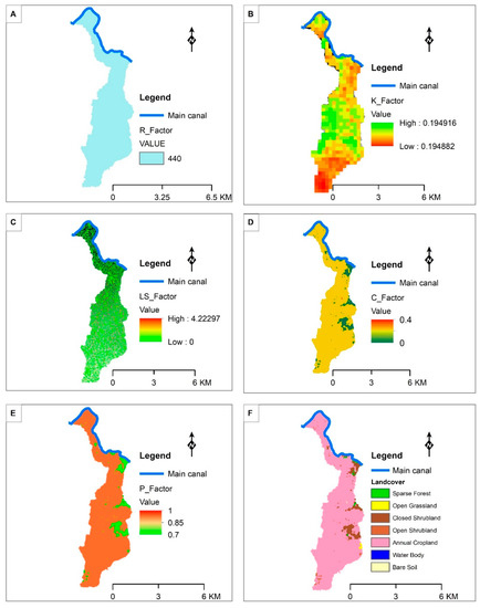 Raster maps of catchment contributing overland sediment inflow to the main canal of the Ketar scheme. (A–E) depict factors of the revised universal soil loss equation. (A): Mean annual soil loss (R factor); (B): soil erodibility (K factor); (C): slope length and steepness (LS factor); (D): land cover and management (C factor); (E): support practices (P factor). (F): Maps land cover in the study area.