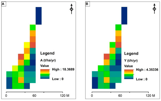 Annual soil loss (A) and sediment yield (B) in the catchment contributing overland sediment inflow to the main canal of the Arata-Chufa irrigation scheme.