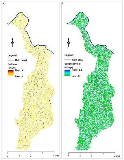Annual soil loss (A) and sediment yield (B) in the catchment contributing overland sediment inflow to the main canal of the Ketar irrigation scheme.