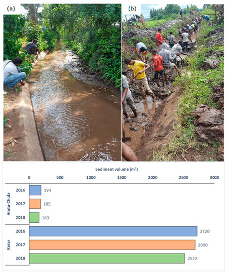 Volume of sediment removed from the main canal of the (a) Arata-Chufa and (b) Ketar irrigation scheme.