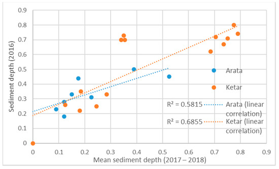 Comparison of the volumes of sediment measured in 2017 and 2018 to the sediment volumes estimated for the year prior to the fieldwork (2016) indicate a decrease in sediment volumes from 2016 to 2018, by 10.3% and 4.2%, respectively, for the Arata-Chufa and Ketar schemes. There is a strong correlation between the sediment volume in 2016 and the mean of the sediment volumes in 2017 and 2018, with the correlation being 0.76 for Arata-Chufa and 0.83 for Ketar (Figure 11).