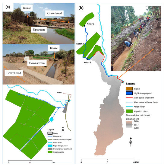 Soil erosion also affects the overall performance of irrigation schemes. Due to excessive sedimentation, many irrigation schemes have been abandoned or operate far below full capacity [12,13]. In Ethiopia, most irrigation systems are the river diversion type. However, the country’s rivers carry huge sediment loads, and therefore are a major source of sedimentation. Although soil erosion from the upland catchment is the ultimate source of sedimentation in many irrigation schemes, the specific source of sedimentation varies with the mechanism through which the sediment enters an irrigation scheme. An irrigation scheme can be threatened by sediment that comes from a river and an overland flow. River sediment enters an irrigation scheme via an intake structure. For example, Gurmu et al. [14] found that river sediment contributed more than 95% of the total sediment deposition in the studied irrigation schemes. Nonetheless, overland erosion flow can also contribute large quantities of sediment. The overland sediment inflow from onsite soil erosion of the catchment area after the intake structure (upland of the main canal) happens when the generated soil loss joins the canal after the intake structures. In some schemes, overland flow is the only source of sedimentation. The Bebeks irrigation scheme, for instance, is threatened only by overland sediment inflow [15]. The scheme is irrigated by entirely sediment-free spring water, nonetheless it performs far below capacity, mainly due to the sediment that entirely comes from an overland flow.