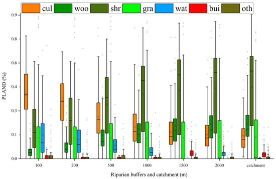 The variations in the land use composition of the riparian buffer widths and catchment. Land use types include the cultivated land (cul), woodland (woo), shrubland (shr), grassland (gra), water bodies (wat), built-up land (bui) and other land (oth).