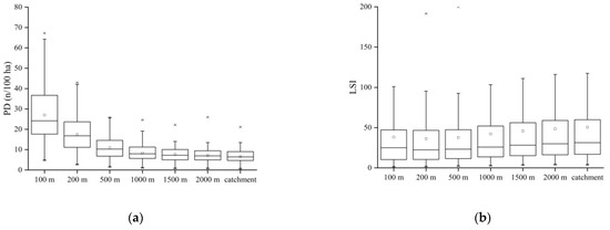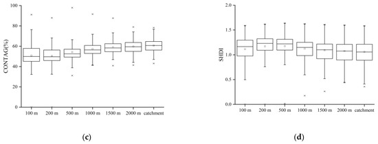 Land use metrics representing the spatial configurations of the riparian buffer widths and catchment: (a) PD means the number of patches per unit area (number per 100 ha); (b) LSI provides a standardized measure of total edge or edge density that adjusts for the size of the landscape; (c) CONTAG describes the degree of agglomeration or spreading trend of different patch types in the landscape; (d) SHDI equals minus the sum, across all patch types, of the proportional abundance of each patch type multiplied by that proportion.