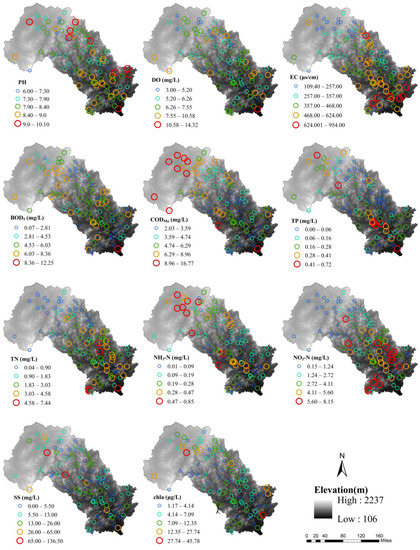 The spatial variations in the water quality parameters in the Luanhe River basin.
