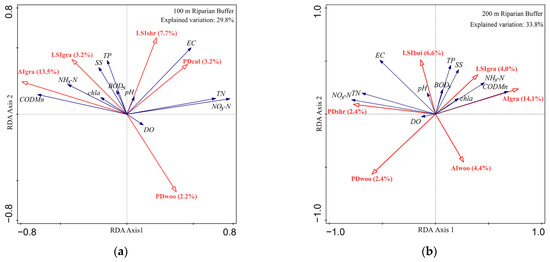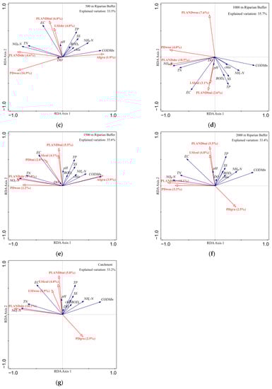 Redundancy analysis (RDA) biplots showing the correlation between water quality variables (black arrows) and land use variables (red arrows). (a–f) respectively represent the scale of a riparian buffer with different widths (100 m, 200 m, 500 m, 1000 m, 1500 m, and 2000 m), and (g) represents catchment scale.