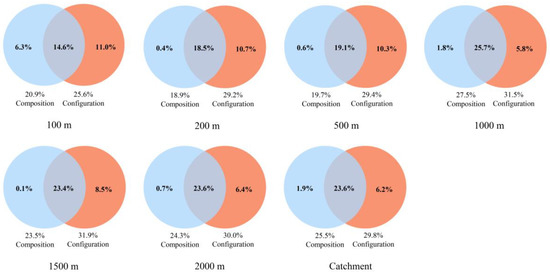In terms of the change trends at spatial scales, the individual explanatory ability of the land-use composition and configuration in the 100 m buffer was the largest. With increasing buffer width, the individual explanatory ability of the land-use composition ranged from 0.1% to 1.9%. The range of individual explanatory abilities was 5.8–10.7%, and the overall trend decreased. Additionally, the joint explanatory ability of land use composition and configuration in the 100–1000 m buffer widths showed a gradual increase and remained stable when the buffer exceeded 1000 m.