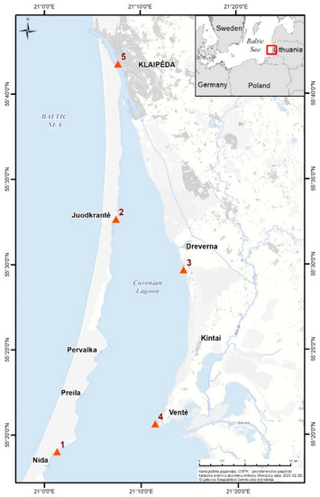 Study sites in the Curonian Lagoon. The numbers indicate the sampling stations: Station 1—Nida, Station 2—Juodkrantė, Station 3—Dreverna, Station 4—Ventė, Station 5—Smiltynė.