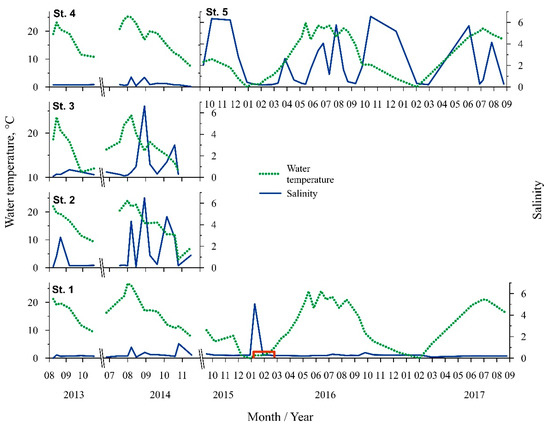The highest water temperature was recorded in July 2014 (26.8 °C, St. One, Figure 2). The average annual water temperature during spring (March–May) was 9 ± 5.8 °C, summer (June–August)—21 ± 2.5 °C, autumn (September–October)—13 ± 4.4 °C, while during winter (December–February) the water temperature was 2 ± 2.5 °C. Ice cover was observed in January–February 2016 (St. One, Figure 2).