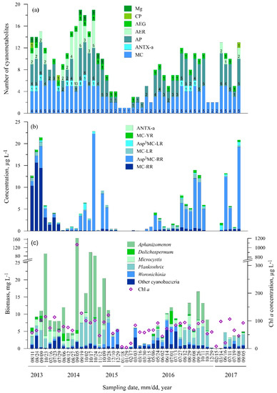 Nine microcystins and anatoxin-a were found at Station One during the whole study period (Table S1). Evident of the dominance of microcystin MC-RR was observed in 2013 and July 2014, while [Asp3]MC-RR dominated the rest of time. MC-RR was found in all the samples, while [Asp3]MC-RR was found in 67% of the samples (Figure 3b). The highest concentrations of these variants were measured during August–October: MC-RR—15.61 µg L−1 in 2013, [Asp3]MC-RR—22.19 µg L−1 in 2014 and 18.77 µg L−1 in 2017. The lowest concentrations of MC-RR (up to 0.11 µg L−1) were detected during the January–March period. Microcystins MC-LR and [Asp3]MC-LR were found in 83% and 35% of the samples, respectively, but at low concentrations (<1.5 µg L−1). Microcystin MC-YR was found in all of the samples except during the cold period (October 2015–April 2016 and December 2016–March 2017), and the highest concentration was detected in 2016 (0.72 µg L−1). Microcystins MC-LY, MC-LF, [Asp3MeSer7]MC-RR, and [Dha7]MC-HtyR were found very rarely during the study period (<4% of the samples). Anatoxin ANTX-a was found in July–October in 2013, 2014, and 2016; its concentrations ranged from 0.01 µg L−1 to 0.25 µg L−1.