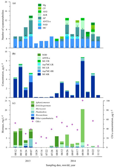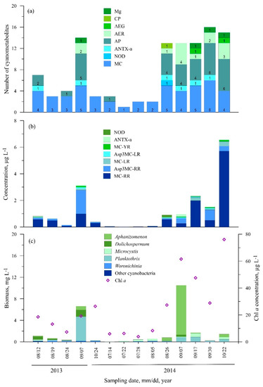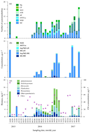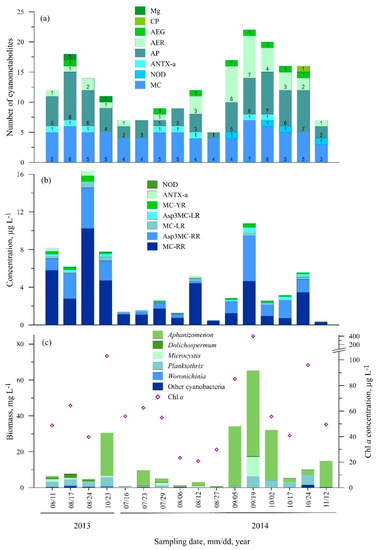 In total, 31 cyanometabolites were found at St. Two with a maximum of 22 different compounds per sample in 2014 (Figure 4a, Table S1). In terms of toxic cyanometabolites, ten different variants were detected: eight microcystins, anatoxin, and nodularin. Microcystins [Asp3]MC-RR and MC-RR were predominant and found in all of the samples (Figure 4b). The highest concentration of MC-RR was measured in August 2013 (10.20 µg L−1) while the highest concentration of [Asp3]MC-RR was measured in August (4.35 µg L−1) and September 2014 (4.85 µg L−1). MC-YR also was found in all of the samples; however, its concentrations did not exceed 1 µg L−1. In comparison to other microcystins, MC-LR and [Asp3]MC-LR were less abundant (88% and 63% of the samples, respectively) and their concentrations did not exceed 0.70 µg L−1. Microcystins [Asp3]MC-RY, [Asp3MeSer7]MC-RR, and [Dha7]MC-HtyR were found very rarely over the study period (<13% of the samples) (Table S1). Nodularin was detected in September–November 2014; the concentrations varied from 0.06 to 0.12 µg L−1. ANTX-a was detected in half of the samples, with the highest concentration (0.51 µg L−1) measured in August 2013.
