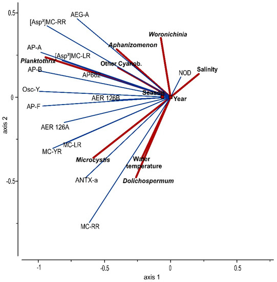 The redundancy analysis (RDA) was applied using Brodgar (2.7.5) and R (3.3.3) packages to test the relationships between the abiotic factors (water temperature, salinity), the biomass of the different cyanobacteria species (used as explanatory variables) and cyanometabolites produced by cyanobacteria as response variables. All response and biological explanatory variable data were square root-transformed. The Brodgar generated RDA biplots that were interpreted were based on explanatory factor line directions and lengths and response variable lines [43]. Only the most abundant cyanometabolites (found in more than 12% of the samples and NOD) were applied for the statistical analyses.