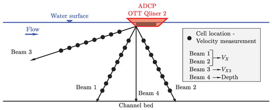 The velocity measurements in this study were acquired with Qliner 2, a 2MHz ADCP manufactured by Ott Hydromet. This device is valid for medium and small streams with depths up to 10 m, providing velocity profiles by sampling velocity in multiple cells along a vertical segment. It is equipped with four beams to determine among others the streamwise velocity, (with a 0.1 m vertical resolution) or optionally (with a 0.04 m vertical resolution) near the free surface, the mean vertical velocity and the water depth, as shown in Figure 1. Note that the velocities in the top layer of the profile cannot be measured due to the device submergence, the blanking distance and the flow disturbances caused by the ship [4,10]. Furthermore, the bottom layer cannot be measured either due to the side-lobe interference [4]. The reader is referred to the instrument data sheet for further information. Qliner software computes the unmeasured profile at the top and bottom by extrapolating the measured velocity profile assuming a power distribution law, which is used in the velocity-area method to compute the average velocity.