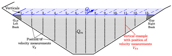 where N is the total number of verticals and is the distance of the verticals from the left bank. Therefore, is the width associated with the panel at the n-th vertical. Besides, is the distance measured from the left bank to the right bank, i.e., the total width of the cross-section. All variables involved in Equations (1)–(4) are provided by the Qliner software. Above, and are the bank flows [36], out of the area covered by direct ADCP measurements, as shown in Figure 2.