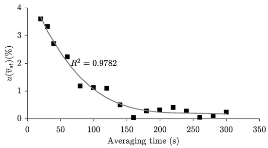 - Sampling time, : Velocities at any point in the cross-section are continuously and randomly fluctuating due to turbulence. Sampling the flow over a time interval is required to estimate the mean velocity at a point in order to disregard the turbulence influence. The duration of this measurement is labelled here as sampling time, although other terms are used in the literature such as measuring time [29,30] or exposure time [31]. Sampling time uncertainty is site-dependent, as the flow temporal scales depend on the flow regime, channel geometry and boundary roughness. There is no clear agreement on the appropriate method for selecting the required sampling time [29,31]. One possible solution was applied by [10] by measuring long sampling periods at a fixed position and analyzing the acquired data by applying a cumulative moving average and examining the mean values and dispersion for different time series. The results are shown in Figure 3. The conclusion was that s sampling time were necessary to stabilise the mean velocity value, which agrees well with previous studies in the literature [32,33]. In this work the sampling time was s, which according to Figure 3, has an associated standard uncertainty of about 2.5%, consistent with that suggested in Table E.3 of [13].