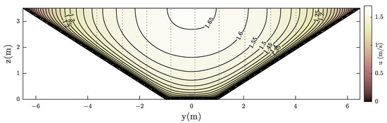 where is the variation of the friction slope in the cross-stream direction with the centre of the cross-section at and is the minimum friction slope assumed (). The minimum value is always positive, due to the fact that the flow cannot reverse, therefore the friction slope cannot have an opposite sign to the flow direction. Once the numerical model is solved, it allows the numerical integration of the velocity distribution to obtain the total flow discharge.