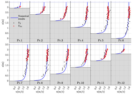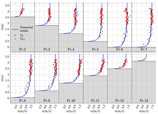 Figure 4 represents the velocity distribution of the hydraulic model for measurement 3b. The position of all measured verticals is shown with grey dashed lines. Figure 5 represents all velocity profiles of the measured verticals where the model results and the measured velocities ( and ) are shown. The velocity profiles illustrate that the coherence between the model results and the measured velocities is quite good. Hence, the hydraulic model is able to reliably reproduce the measurements.
