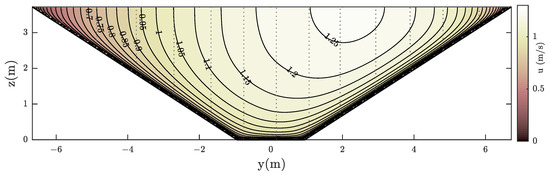 The results in section GG7 support the conclusions induced by section GG11, validating the hydraulic model as a good alternative to the velocity-area method. Again, the discharges of both methods are coherent and there are no significant differences between them. There is a notable region of overlap between the confidence intervals derived from the application of both methods. The discharge confidence interval of the hydraulic model is entirely within the one of the velocity-area method. Another example of the good behaviour of the hydraulic model is presented in Figure 6 and Figure 7. In this case, the measurement corresponds to 2b case. Figure 6 represents the velocity distribution of the hydraulic model which is asymmetric (downstream of a slight bend). Unlike the previous case, the variation of the friction slope has been considered as a state variable. Its value is estimated with the SE process together with the rest of the state variables. Figure 7 represents the velocity profiles of the measured verticals where the model results and the measured velocities ( and ) are presented. There is again very good agreement between the results of the hydraulic model and the measurements, and the hydraulic model replicates the measurements closely even with asymmetric velocity distribution.