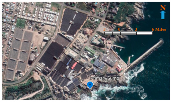 Abagold Limited is a South African abalone (Haliotis midae) hatchery, grow-out, and processing facility situated in the New Harbour of Hermanus, South Africa. Characterized by injections of the warm Agulhus current and cold Benguela current, Walker Bay is prone to frequent upwelling of cold, nutrient-rich water in the summer months (November–March) interjected by warm water events. Historically, this has resulted in algal blooms, which can affect the production of aquaculture facilities. The farm is a land-based, flow-through system housing some 650 tons. Data was collected via Xylem WTW IQ Sensor Net probes [33], situated in the primary and secondary sumps distributing incoming seawater to the farming platforms (see Figure 1).