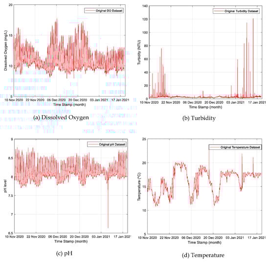 A total of 20,730 sets of non-linear and non-stationary water quality parameters time-series data were collected at Abagold between November 2020 and January 2021. The water quality parameters included dissolved oxygen, turbidity, temperature, and pH. The collected datasets are shown plotted as line graphs in Figure 2a–d. The trend variations of DO (mg/L), turbidity (NTU), pH (m/L), and temperature (°C) are shown in Figure 2a–d between November 2020 and January 2021.