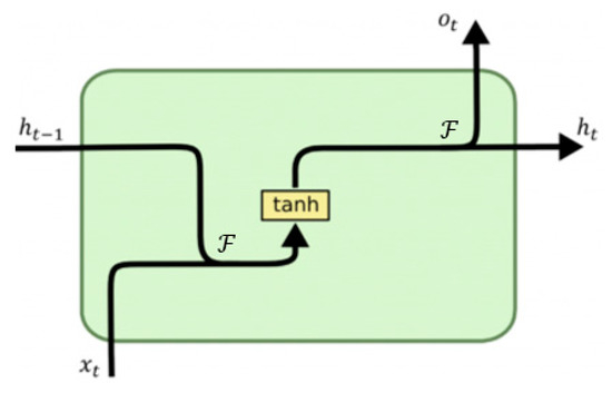 DL-LSTM NNs [22,23,42] are a special type of recurrent NN (RNN) with a significant improvement and the ability to learn long-term dependencies, which gives it an advantage over other artificial NNs such as BPNN, RBFNN, etc. Figure 3 illustrates a typical schematic diagram of a traditional RNN node with the previous hidden state represented by , activation function by , current input sample by , current output by , and the current hidden state by . As depicted in Figure 3, all RNNs generally have the form of chain repeating modules of NNs. These repeating modules generally have a very basic structure in standard RNNs, like a single tanh layer only. However, DL-LSTM, which stores information with the aid of purpose-built memory cells, maintains a similar chain-like structure but with a different structured repeating module (see Figure 4). As illustrated in Figure 4, there are four distinct interacting layers in a DL-LSTM cell.