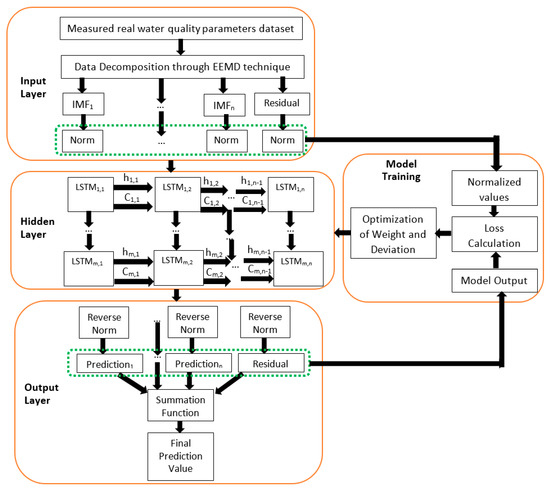 In the second stage, the different IMFs and the corresponding residual item is utilized for the prediction by the DL-LSTM NN after normalization in the hidden layer of Figure 5. Lastly, a reverse normalization operation is performed on the individual prediction results of the DL-LSTM NN before efficiently combining all the individual prediction results together using a summation operation, with the aid of the summation function, to get the final predicted values, as shown in the output layer of Figure 5. As clearly illustrated using the extended novel hybrid model with manifold hidden DL-LSTM layers (LSTM1,1, LSTM1,2, …, LSTMm,1, up to LSTMm,n) in Figure 5, individual hidden layers of the stacked DL-LSTM is equipped with various memory cells thereby, earning the proposed prediction model the term deep learning NN method [42]. The flowchart in Figure 6 demonstrates the entire proposed water quality parameters prediction process.