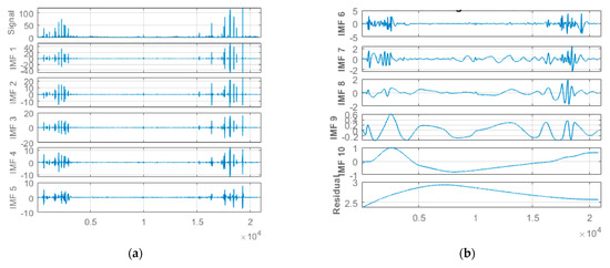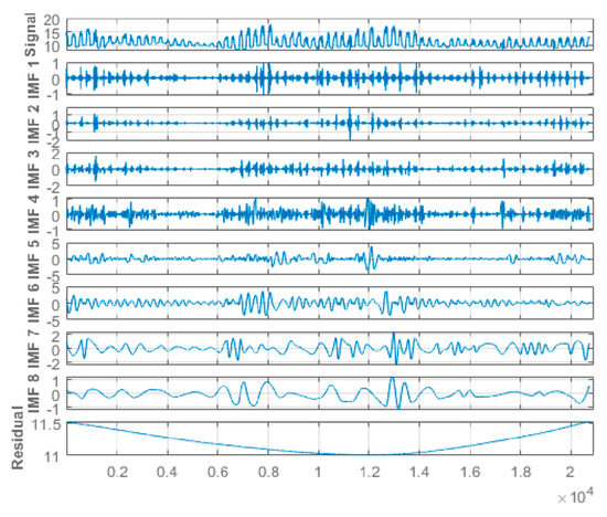 In accordance with the stopping criteria [39], the sifting process aids the refining of the above procedure by repeating step (a) to step (d) on the signal till it has a zero-mean. The result of the signal decomposition can only be considered as an effective IMF once the zero mean is achieved. Subsequently, the corresponding residual of the signal is generated by applying step (f).