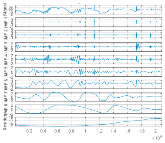Eight (8) different IMFs and the corresponding residual for the water temperature data signal.