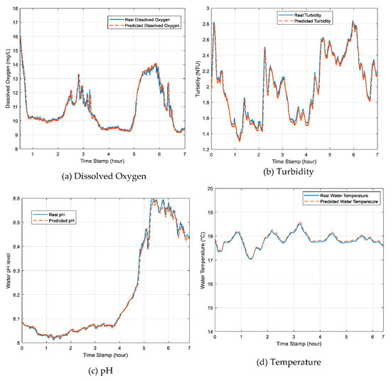Comparison of real water quality parameters values and the predicted values: (a) dissolved oxygen, (b) turbidity, (c) pH, and (d) temperature.