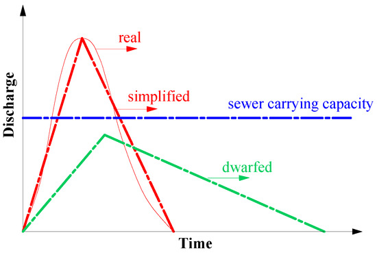 As indicated in Figure 1, a typical Cypress–Creek hydrograph (red straight line) can be approximated to a triangle (red dashed line), with the peak flow of the discharge equal to the height of the triangle, the discharge duration equal to the base of the triangle, and the total discharge volume equal to the area of the triangle [21]. Without modifying the urban sealed surfaces, the runoff volume remained unchanged so the area of the triangle is unchanged as well. This means that attenuating the peak-flow discharge must be done by extending the discharge duration, as indicated in Figure 1 (the dwarfed triangle). Such an extension is practically possible because the sewer is always idle during the interim between two heavy rain events. If this idle time is used to drain the rainwater, the peak flow could be attenuated. As indicated in Figure 1, the red triangular hydrograph can be modified to a new dwarfed triangle that has a height lower than the carrying capacity of the sewage (green dashed line). By extending the discharge duration, the rainwater can continually discharge a smaller volume of water through a small space for a longer time than those of the original discharge (the red triangle); that is, time is traded for space.