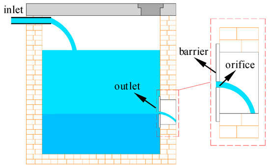 The buffer tank location and the orifice size are site-specific. To save construction cost, the buffer tank should be close to the existing municipal network, such as green belts or sidewalks. In areas where water is a scarce resource, the buffer tank could be installed near residential areas for reusing the harvested water. Similar with other facilities for attenuating the peak flow of runoff, the buffer tank newly developed in this study may be prone to clogging when it is improperly designed. If the drain orifice is set at the bottom of the tank, it would be eventually clogged by dredges because rainwater-carrying particles preferentially settle at the bottom. It is optional to set the drain orifice at the side wall of the tank and at an elevation from the tank’s bottom. The tank’s sidewall is commonly 5–10 cm thick reinforced concrete to resist the internal water pressure against the wall because the tank can detain rainwater to a height of 1–2 m in case of heavy rain. Opening a tiny orifice on such a thick wall is unwise because such an orifice would be prone to be clogged by dredges that settle when the discharge rate is low. It is wise to intentionally leave a hole in the tank’s wall and cover the hole with a thin barrier that has an orifice drilled at the center (Figure 2). Under the orifice is a dead storage space hosting water that cannot drain through the orifice. Water in the dead storage is optional for non-portable water use such as irrigation. The size and orifice number of a buffer tank is customized to avoid overflow in case of heavy rain.