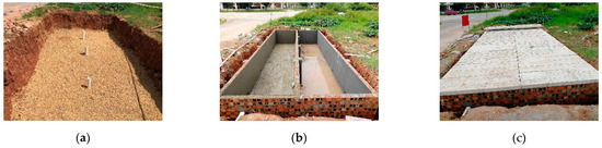 Schematic diagram of the buffer tank. (a) Pit excavation for the tank; (b) construction of the buffer tank. (c) The buffer tank with reinforced roof.