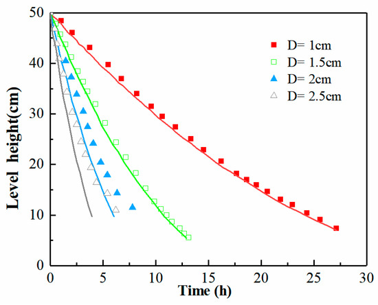 As indicated in Figure 4, the drop of the water head approximately obeys the Torricelli law. The measurement water heads are lightly higher than those estimated by the Torricelli law. This deviation is reasonable because the Torricelli law is idealized and neglects the viscous resistance of the water from the small drainage orifice. As indicated in Figure 4, the observed water head deviates more from the theoretical one in case of a greater size of drain orifice. Taking the water head at 10 cm as the limit, when the drain orifice diameter is 2 cm and 2.5 cm, the actual drainage time is extended by about 2 h and 2.5 h, respectively, compared with the theoretical one. This deviation is reasonable because water discharges from a larger drain orifice is turbulent flow, while the Torricelli law assumes the outflow is a laminar flow. Except these deviations for the case of the greater drain orifices (2 cm, 2.5 cm), the observed water head is very close to the theoretical one, verifying that water head dropping in the water tank obeys the Torricelli law.