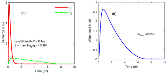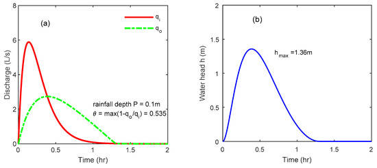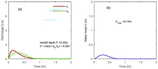 In reality, the water enters and drains from the buffer tank simultaneously. Correspondingly, the water head can drop or rise during a rain event, depending on the rain depth and the tank’s size. To simulate this process, here, we assume that a buffer tank with a cross-sectional area of 100 m2 and that the runoff coefficient is 0.80. The buffer tank is also assumed to be cubic in shape. The corresponding outflow, (m3/s), is