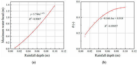 We further simulate the peak-flow attenuation rate and water head of the buffer tank under conditions that the rainfall depths range from 0.01 to 0.10 cm. We found that the culmination of the water head in the buffer tank increases exponentially with the rainfall depth (Figure 8a). This trend further verifies that the tank is not filled in case of small and medium rains and reserves spaces for detaining water in case of heavy rain. The trend also means that, at sites with an extreme rainfall depth greater than 0.10 m, the tank would overflow, so a bigger tank should be designed (Figure 8b). Similarly, the peak-flow attenuation rate rises with the rainfall depth following a logical law. This trend further verifies that the buffer tank attenuates a greater rate of the peak flow in case of heavy rain. Therefore, the buffer tank must be designed site-specifically to attenuate the peak flow to an anticipated level for avoiding flooding and overflow.