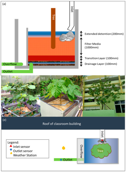 For the field study, the study area was located in an educational institute in the west of Singapore. The MBT system was situated between an open field, school field, and classroom blocks. Talipariti tiliaceum has been selected for the field study due to its better TN removal performance. Roof catchment from the surrounding classroom buildings (100% imperviousness, 90 m2) was channeled into the MBT system. The MBT system had a surface area of 3.7 m2 and a filter media depth of 1.0 m. The transition and drainage layers were 0.1 m and 0.3 m, respectively. The overflow manhole allowed for a maxi-mum detention depth of 0.2 m (Figure 1d). This unique engineering design allowed for a small compact system, which limited the spread of roots within the system, allowing for a deeper root system. The MBT system was also constructed offsite and was brought to the study area for installation, which reduced the time needed for on-site construction. As such, the MBT could be positioned and retrofitted easily in an urban setting dominated by impervious infrastructures.