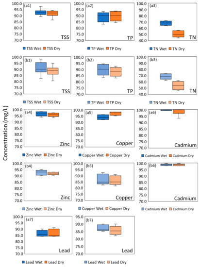 The EMC removal percentages of TSS and TP were likely to be independent of the wet/dry periods. The difference in the mean EMC removal percentages for TSS and TP were 1.0% and 0.7% (both p > 0.05) for TT1 between the different periods, while the difference in the mean EMC removal percentages for TSS and TP were 2.5% and 2.0% (both p > 0.05) for TT2 between the different periods. This suggested that the removal mechanisms for TP and TSS were not affected by the frequency of rainfall events or the volume and intensity of the rainfall. The adsorption of phosphorous was also likely to be unaffected by the weather conditions. The removals of TN have the most distinctive difference in terms of removal efficiency between the wet and dry periods. A significant difference (14.9% for TT1, 17.7% for TT2, both p < 0.05) was found between the EMC removal percentage of TN in the wet and dry periods. When wet period testing was conducted, the larger volume of influent resulted in a higher volume of retained water in the system. The retention of water in the system created pockets of anoxic submerged zones, which promoted denitrification to occur [66]. NO3− undergoes denitrification and is hence removed from the system through its conversion to nitrogen gas.