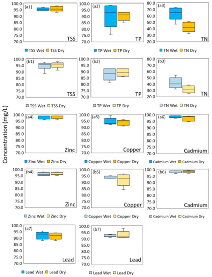 Phase 2 of EMC removal % for (a1) TT1 TSS, (a2) TT1 TP, (a3) TT1 TN, (a4) for TT1 Zinc, (a5) TT1 Copper, (a6) TT1 Cadmium, (a7) TT1 Lead, (b1) EMC removal % for TT2 TSS, (b2) TT2 TP, (b3) TT2 TN, (b4) TT2 Zinc, (b5) TT2 Copper, (b6) TT2 Cadmium, and (b7) TT2 Lead.