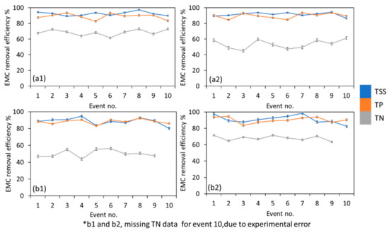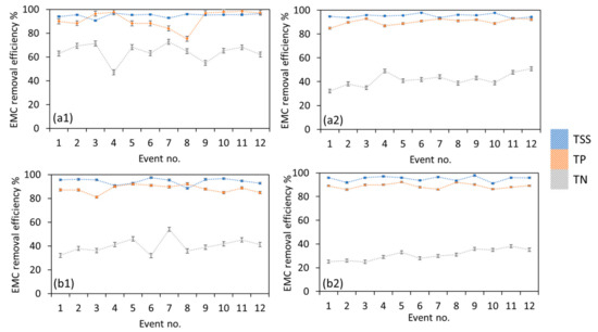 Phase 2 EMC removal efficiency of TSS, TP and TN for (a1) TT1 in dry condition, (a2) TT2 in dry condition, (b1) TT1 in wet condition, (b2) TT2 in wet condition.