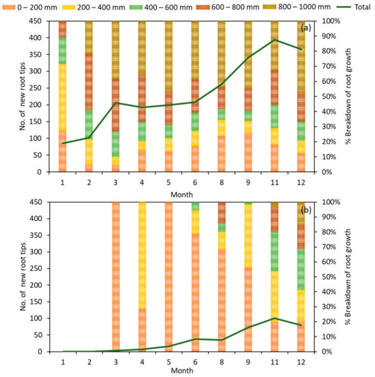 (a) The number of new root tips observed at different depths of the biofilters planted with Talipalitri tiliaceum, TT1 and (b) Sterculia macrophylla, TT2 in the bioretention system for the pilot study over a period of 12 months.