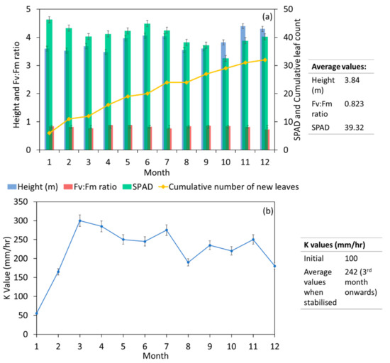 The T. tiliaceum tree in the MBT was monitored for the first 12 months, and the indices for plant growth are reflected in Figure 7a. The height of tree, Fv:Fm ratio, and soil plant analysis development (SPAD) factor remained fairly constant throughout the study. The average height of the tree was noted to be 3.84 m while the average Fv:Fm ratio was 0.823 over 12 months. Tree height remained consistent, with a minute difference in growth height throughout the period of study. The tree in this study depicted a Fv:Fm ratio range from 0.73 to 0.88. This result is similar to other tree phytoremediation studies in the tropics [37,76], which shows that the plants are healthy. Furthermore, SPAD sampled at the top of the tree also had a fairly constant value, with an average of 39.32, indicating that the tree maintained its chlorophyll levels. A demarcated branch near the top of the tree was selected to monitor new leaf growth. Results showed a steady increase in the number of new leaves throughout the study. Based on the definition by Chen et al. [37], the T. tiliaceum used in this study was found to have moderate growth with a controlled increase in the number of new leaves. Overall, this suggests that the T. tiliaceum tree is suitable for the MBT, due to its controlled growth and good indication of health.