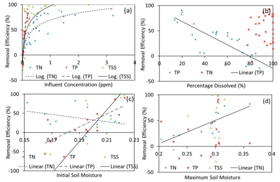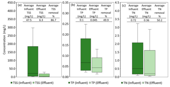 Various environmental factors were explored to have a better understanding of MBT performance in field conditions, and these are summarized in Figure 9. Understanding design and environmental factors is essential to better assess the performance of MBT. This is particularly important for the prediction of the MBT performance and further improvements can be made to optimize this design for other locations with different environmental conditions. Influent pollutant loading is an important factor that affects the removal performance of the BRS [93]. As seen in Figure 9a, as influent pollutant concentration increased, higher removal efficiency was achieved. This is likely due to the strong influence of ‘background’ pollutants. McNett et al. [94] found that effluent nutrient pollutant concentration was strongly influenced by the ‘background’ pollutant concentration and less affected by the influent pollutant concentration. The effluent concentration is controlled by the characteristics of the media filter and not by pollutant loading, though this phenomenon is more prominent for phosphorus than nitrogen.