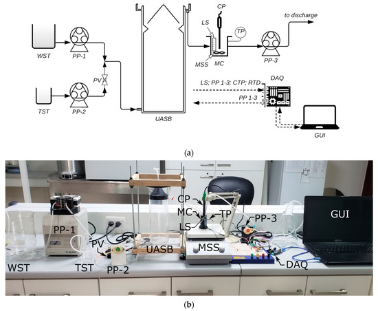 This paper aims to propose and evaluate a system capable of automatically obtaining RTD curves in laboratory-scale reactors and discuss the main factors that affect the representativeness and accuracy of RTD curves at this scale. The proposed system comprises a control device for feeding the tracer and the test water, a flow measurement unit, a tracer concentration and effluent temperature measurement system, and a data processing unit. The system was tested in an upflow anaerobic sludge blanket (UASB) reactor [21], which is one of the most used anaerobic reactors worldwide [22] and a promising and sustainable wastewater treatment technology that could be improved to meet goals 6 and 7 of the United Nations Sustainable Development Goals (SDGs) [23]. A fundamental characteristic of this type of reactor is that its treatment efficiency greatly depends on its flow hydrodynamics [18,24]. Therefore, it is of great interest to have an accurate and detailed hydrodynamic characterization of the reactor. It is expected that the tool proposed herein could advance our understanding of the hydraulic behavior of fluids and allow us to improve the design of UASB reactors.