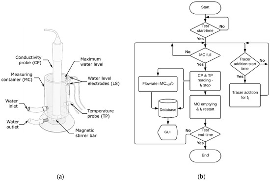 (a) Parts of the measuring container, (b) Operation flowchart of the automated RTD measurement system. Nomenclature: MC—measuring container; CO—conductivity probe; TP—temperature probe; tf—measuring container filling time; tt—tracer addition time; MCvol—measuring container volume.