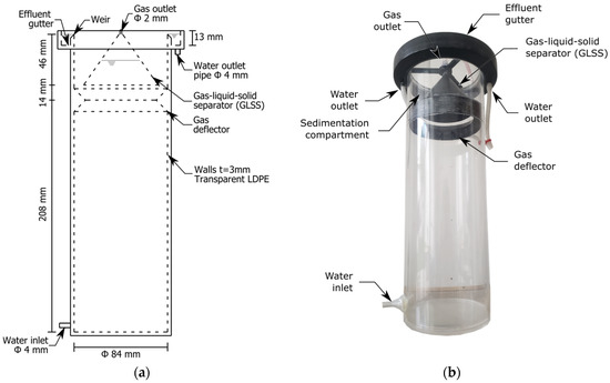 Laboratory-scale UASB reactor. (a) Reactor dimensions in cross-section image; (b) Picture of the reactor.