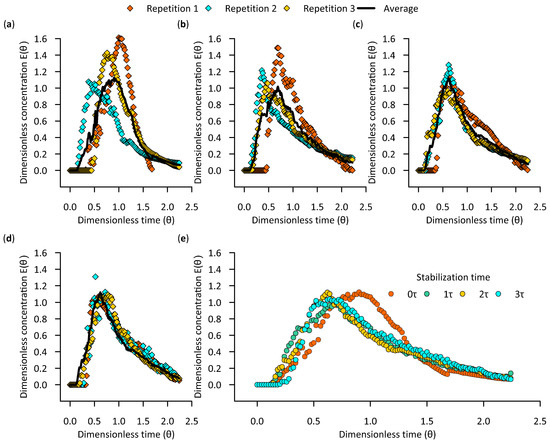 Once the reactor has been filled with the test water and before the tracer is injected, it is necessary to allow the reactor to operate undisturbed long enough to obtain developed and stabilized flow patterns. These patterns have a marked influence on the tracer’s dispersion and, consequently, on the reactor’s hydraulic characterization. If flow stabilization is not achieved, there is a risk that the flow patterns are partially formed, generating RTD curves with short-circuiting, channeling, and dead zones magnitudes far from those that represent the hydraulics of the scaled reactor. These effects and how different stabilization times influence the shape of the RTD curves are shown in Figure 4a–e. The results shown in these figures were obtained using low conductivity test water ), keeping the tracer and the test water at the same temperature.
