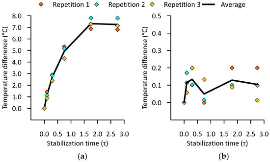 In laboratory-scale reactors, the temperature of the test water and the tracer–water mixture should be monitored and controlled as temperature differences between the two fluids can alter the development of flow patterns within the reactor and, as a result, affect the tracer’s dispersion. This study identified that this temperature difference was mainly caused by the heat transfer from the ventilation systems of the main peristaltic pump (PP-1) and the control PC (see details in Section 2.1). The ventilation system of PP-1 is composed of a rear fan and air vent, and that of the PC is composed of two fans with side and rear air vents. No specific technical information was found on the heat emission produced by PP-1 or the PC. The temperature variations that these heat emissions produced in the test water and the tracer–water mixture during the test stabilization period are presented in Figure 5a,b. In Figure 5a, when the container TST was close to PP-1 and to the control PC (within a radius of 30 cm), it can be seen that the heat transfer can produce a temperature difference between the test water and the tracer–water mixture of up to upon reaching . This temperature variations could affect the representativeness of the generated RTD curves. In Figure 5b, when the container TST was far from heat emitting sources (separated at a distance greater than 80 cm radius), it can be observed that the temperature difference at stabilization time does not exceed . Thus, the best practice to avoid relevant temperature variations between the test water and the tracer–water mixture is to locate the tracer container close to the test water container, as far away as possible from any heat-emitting equipment.