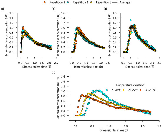 The effect of the temperature difference between the tracer and the test water on the RTD curves is shown in Figure 6a–d. These results were obtained by maintaining a stabilization time of and using test water with a conductivity of . The figure shows that the larger the difference between the tracer’s temperature and the test water, the larger the flow channeling and stagnant zones detected in the RTD curve. The average RTD curve that was generated with a tracer–water mixture with a temperature of 10 °C higher than the test water (Figure 6a) produced a peak at , showing that the reactor’s hydraulics are influenced by stagnant zones or channeling that originate from the presence of flows with different temperatures slowly dissipating until they become uniform. The average RTD curve that was generated with (Figure 6b) obtained an at , indicating that the formed stagnant or channeling regions are not as intensely marked as in the previous case, approaching the values obtained by the RTD curve in which flows with the same temperature (Figure 6c) were used at . Figure 6d shows an inverse correlation between the tracer’s first appearance time and the tracer–test water temperature variation. The figure also shows that the tracer output rate, reaching its peak, decreases as the temperature variation between the flows tends to zero.