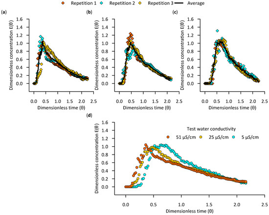 If tap water is used to perform the tracer tests, it is important to consider that its quality changes over time along with its conductivity due to the addition of chemical reagents during the water purification process. Therefore, even if the same experimental conditions are maintained, the resulting RTD curves will diverge due to the subtle effects of conductivity altering the flow patterns. These divergences can be minimized by storing enough tap water of the same quality to complete all the tests that will be performed. The effects of conductivity in the test water when obtaining RTD curves using a stabilization time of and keeping the tracer–water mixture and the test water at the same temperature are shown in Figure 7a–d. The test water of two of these experiments was obtained directly from the laboratory faucet on two different days, getting conductivities of and . The RTD curves generated with these test waters are similar, especially in the peaks’ location and the development of the tail. However, there is a visible early first detection of the tracer occurring at for water with (Figure 7a) and at for water with (Figure 7b). The early tracer exit may indicate that flow patterns are influenced by stagnant zones or channeling. The repetitions conducted with test water presented scattered tracer concentration measurements. The amplitude of these scattered results decreases as the conductivity of the test water decreases, an effect that is noticed with the test waters of and . Thus, an effective way to reduce scattered results during tracer concentration measurements is to use standardized, low-conductivity water. Highly consistent and representative RTD curves were obtained using type IV reagent water [27] with a conductivity of less than or equal to . Figure 7c shows how the use of test water with a conductivity less than reduced data dispersion during tracer concentration measurements and increased the tracer first detection time to . In Figure 7d, the tracer output rates from the average RTD curves correlate with the conductivity of the test water. This correlation suggests that test water with lower conductivity allows a more effective dispersion of the tracer used in this study within the reactor.